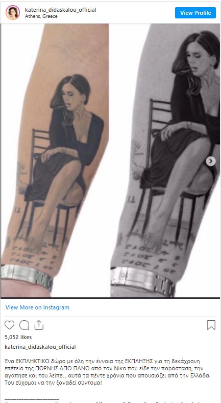 Ο θαυμαστής της επέλεξε να «χτυπήσει» στο χέρι του την «Ερατώ» από το έργο «Πόρνη από πάνω», την οποία και ενσαρκώνει η ηθοποιός στην ομώνυμη παράσταση. Όπως ήταν αναμενόμενο, η Κατερίνα Διδασκάλου συγκινήθηκε ιδιαίτερα βλέποντας τη φωτογραφία και το βίντεο που της έστειλε ο φαν της και τα μοιράστηκε με τους followers της γράφοντας στη λεζάντα: «Ένα ΕΚΠΛΗΚΤΙΚΟ δώρο με όλη την έννοια της ΕΚΠΛΗΞΗΣ για τη δεκάχρονη επέτειο της ΠΟΡΝΗΣ ΑΠΟ ΠΑΝΩ από τον Νίκο που είδε την παράσταση, την αγάπησε και του λείπει , αυτά τα πέντε χρόνια που απουσιάζει από την Ελλάδα. Του εύχομαι να την ξαναδεί σύντομα!».
