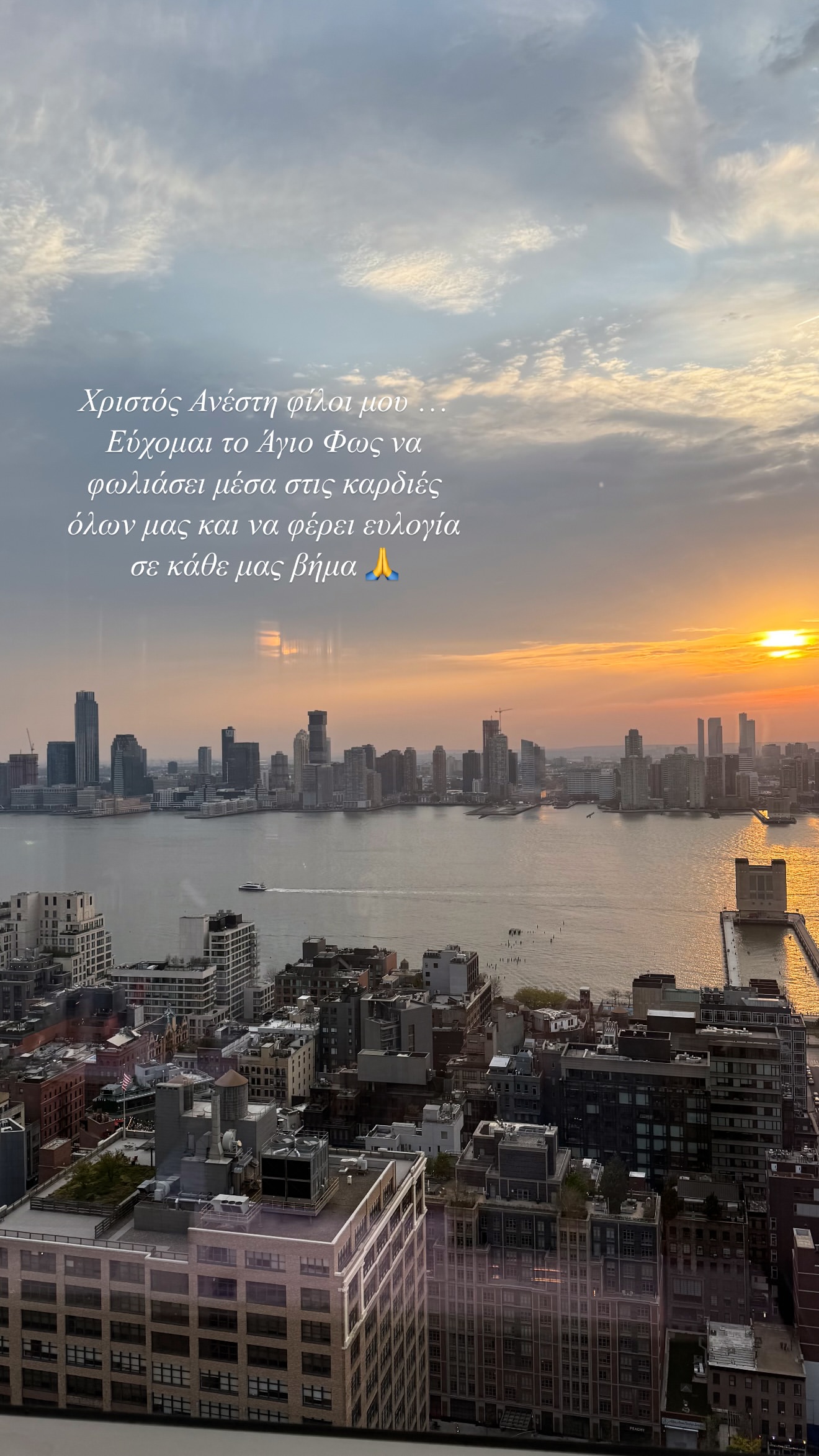 «Χριστός Ανέστη φίλοι μου. Εύχομαι το Άγιο Φως να φωλιάσει μέσα στις καρδιές όλων μας και να φέρει ευλογία σε κάθε μας βήμα», αναφέρει στο στόρυ της με φόντο τους ουρανοξύστες του Μανχάταν.