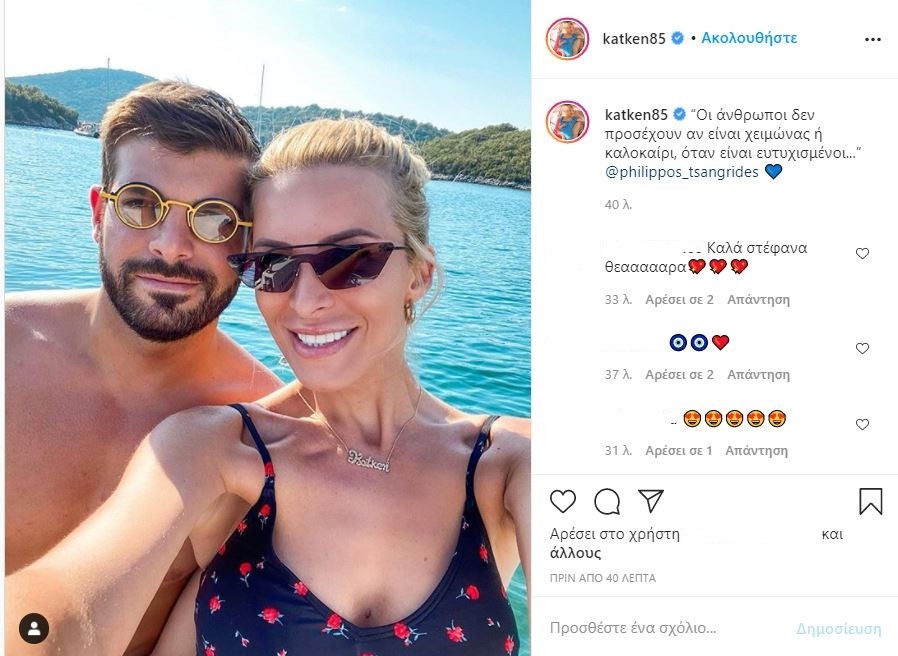 Μία νέα φωτογραφία με τον σύντροφό της Φίλιππο Τσαγκρίδη ανέβασε στον προσωπικό της λογαριασμό στο instagram η Κατερίνα Καινούργιου δείχνοντας γελαστή και ευτυχισμένοι.