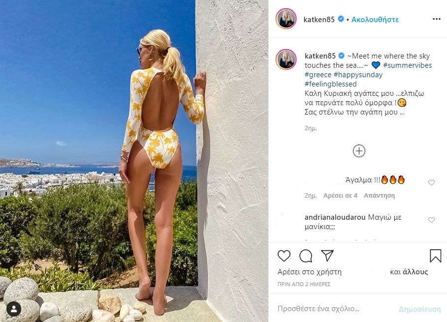 Την αψεγάδιαστη σιλουέτα της επιδεικνύει η Κατερίνα Καινούργιου, η οποία ποζάρει με ολόσωμο μαγιό δείχνοντας στους ακολούθους της την πλάτη της. Και παρά το γεγονός ότι οι περισσότεροι εντυπωσιάστηκαν από τη λεπτή και καλλίγραμμη σιλουέτα της, υπήρξε μία χρήστρια που επεσήμανε ότι βλέπει “αρχές κυτταρίτιδας”. Η παρουσιάστρια απάντησε λέγοντας “θα σε πληγώσω, αλλά για κακή σου τύχη δεν έχω καθόλου”, ενώ προς υπεράσπισή της ήρθαν και άλλοι χρήστες και χρήστριες που απέδωσαν το σχόλιο σε κακεντρέχεια.