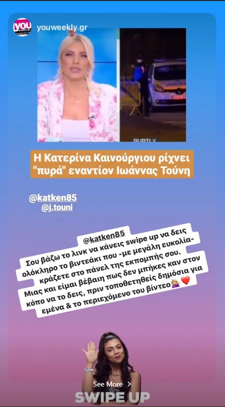 Στη συνέχεια, η Ιωάννα Τούνη απάντησε στο σχόλιο της Κατερίνας Καινούργιου μέσω instagram παροτρύνοντας την παρουσιάστρια να δει ολόκληρο το βίντεο το οποίο κράζουν με μεγάλη ευκολία στο πάνελ της εκπομπής. «Μιας και είμαι βέβαιη πως δεν μπήκες καν στο κόπο να το δεις , πριν τοποθετηθείς δημόσια για εμένα και το περιεχόμενο του βίντεο», σημειώνει η Ιωάννα Τούνη.