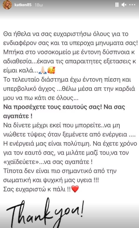 Θέλω μέσα από την καρδιά μου να πω κάτι σε όλους. Να προσέχετε τους εαυτούς σας! Να σας αγαπάτε! Να δίνετε μέχρι εκεί που μπορείτε. Να μη νιώθετε τύψεις όταν ξεμένετε από ενέργεια. Η ενέργειά μας είναι πολύτιμη. Να έχετε χρόνο για τον εαυτό σας. Να μιλάτε μαζί του, να τον “χαϊδεύετε”, να τον αγαπάτε! Τίποτα δεν είναι πιο σημαντικό από την σωματική και ψυχική μας υγεία! Σας ευχαριστώ και πάλι”, έγραψε.