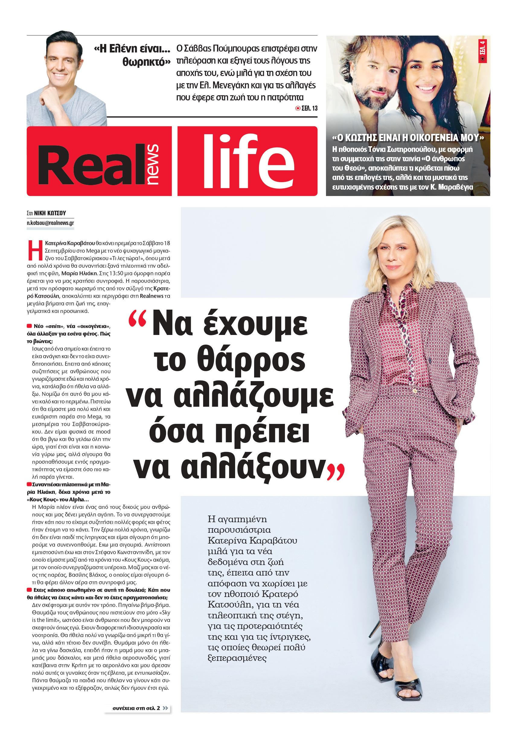 H Κατερίνα Καραβάτου θα κάνει πρεμιέρα το Σάββατο 18 Σεπτεμβρίου στο Mega με το νέο ψυχαγωγικό μαγκαζίνο του Σαββατοκύριακου «Τι λες τώρα!», όπου μετά από πολλά χρόνια θα συναντήσει ξανά τηλεοπτικά την αδελφική της φίλη, Μαρία Ηλιάκη. Στις 13:50 μια όμορφη παρέα έρχεται για να μας κρατήσει συντροφιά. Η παρουσιάστρια, μετά τον πρόσφατο χωρισμό της από τον σύζυγό της Κρατερό Κατσούλη, αποκαλύπτει και περιγράφει στη Realife τα μεγάλα βήματα στη ζωή της, επαγγελματικά και προσωπικά.
