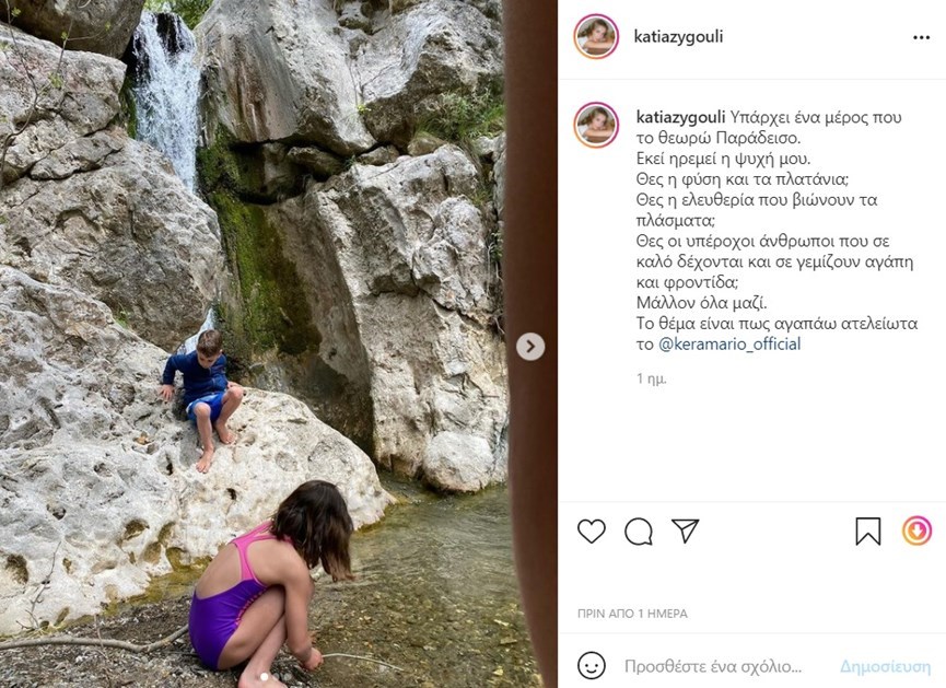 «Υπάρχει ένα μέρος που το θεωρώ Παράδεισο. Εκεί ηρεμεί η ψυχή μου. Θες η φύση και τα πλατάνια; Θες η ελευθερία που βιώνουν τα πλάσματα; Θες οι υπέροχοι άνθρωποι που σε καλό δέχονται και σε γεμίζουν αγάπη και φροντίδα; Μάλλον όλα μαζί», έγραψε χαρακτηριστικά η Κάτια Ζυγούλη.