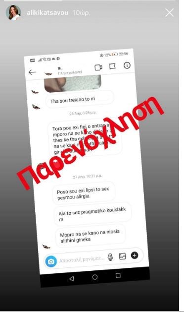 Αυτή τη φορά όμως, η Αλίκη Κατσαβού δημοσίευσε στο Instagram μια διαφορετική φωτογραφία, που απεικονίζει μηνύματα, άσεμνου περιεχομένου, τα οποία έστειλε διαδικτυακός φίλος της. Της έγραφε συγκεκριμένα, ακατάλληλα πράγματα, με αποτέλεσμα η ίδια να κάνει δημόσια καταγγελία. Πάνω στο στιγμιότυπο δε, γράφει με μεγάλα κόκκινα γράμματα τη λέξη “Παρενόχληση“.