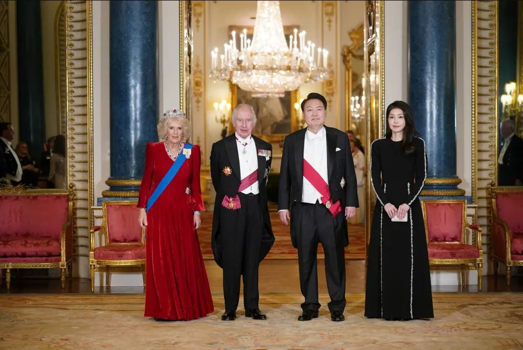Αργότερα εκείνο το βράδυ, το ζευγάρι ταξίδεψε με άμαξα σε έναν δρόμο με βρετανικές και κορεατικές σημαίες προς τα Ανάκτορα του Μπάκιγχαμ. Εκεί οι βασιλιάδες φόρεσαν τα εκλεκτά τους ρούχα, κορώνες και τιάρες για το κρατικό συμπόσιο.