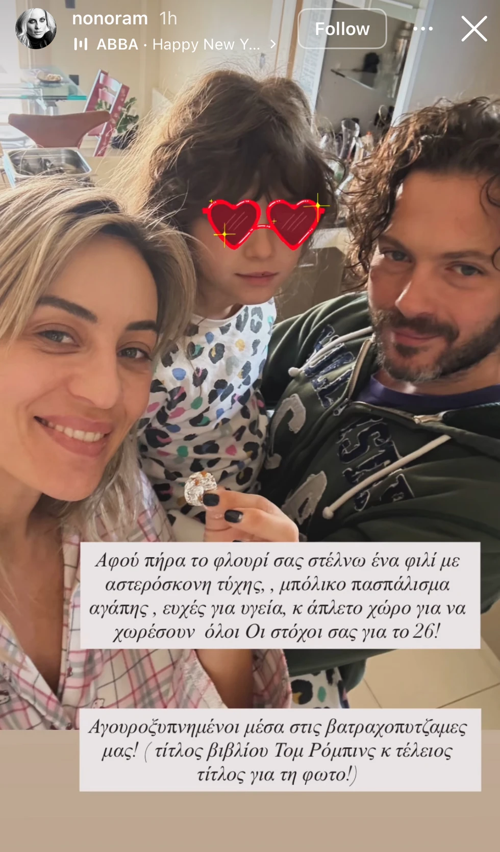 «Αφού πήρα το φλουρί σας στέλνω ένα φιλί με αστερόσκονη τύχης, μπόλικο πασπάλισμα αγάπης, ευχές για υγεία, και άπλετο χώρο για να χωρέσουν όλοι οι στόχοι σας για το 26! Αγουροξυπνημένοι μέσα στις βατραχοπιτζάμες μας! (τίτλος βιβλίου Τομ Ρόμπινς κ τέλειος τίτλος για τη φωτό!)».