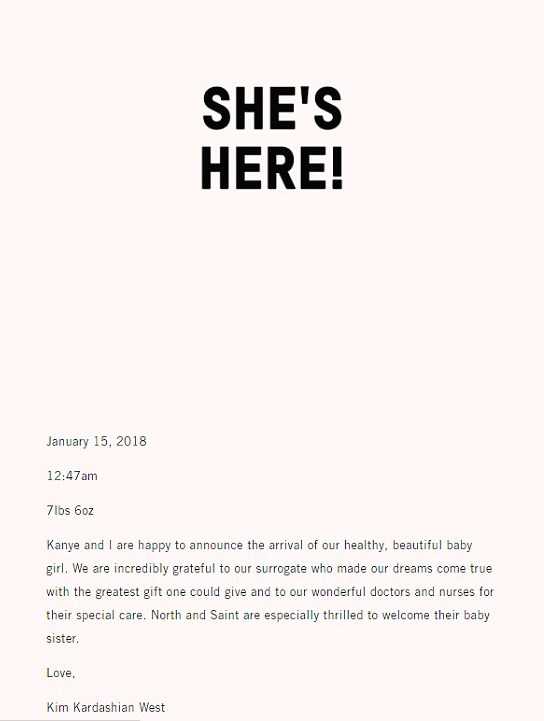 Η Κιμ Καρντάσιαν χθες ανακοίνωσε πως ήρθε στον κόσμο το τρίτο της παιδί με τον ράπερ Κάνιε Ουέστ. Φυσικά, οι προτάσεις για τις πρώτες φωτογραφίες του μωρού “πέφτουν” βροχή.