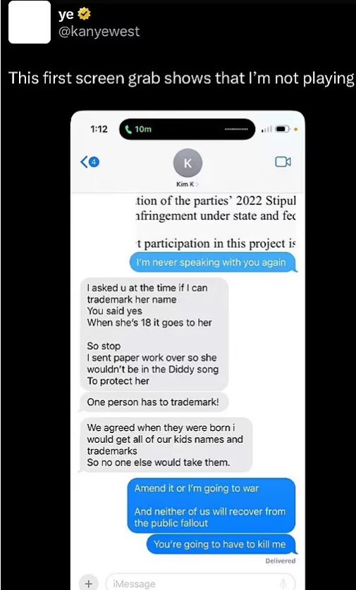 Η Κιμ φέρεται να απαντά: «Σου ζήτησα τότε αν μπορώ να κατοχυρώσω το όνομά της», υποστηρίζοντας ότι εκείνος της είπε «ναι», προσθέτοντας: «Όταν γίνει 18, θα το πάρει αυτή».