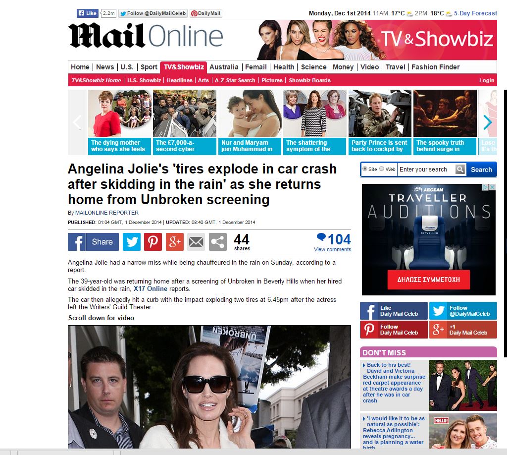 Κινδύνευσε η ζωή της Αντζελίνας Τζολί καθώς επέστρεφε σπίτι μετά την πρεμιέρα της νέας της ταινίας Unbroken στο Μπέβερλι Χιλς.