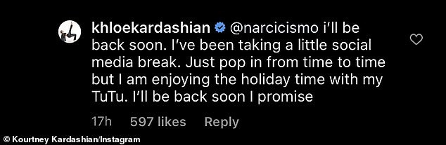 Ενημερώνει καθημερινά τυος ακολούθους της στο Instagram για τη ζωή και τις δραστηριότητές της οπότε η απουσία της έγινε αισθητή με έναν ακόλουθό της να αναρωτιέται τι συνέβη. Η Κλόε Καρντάσιαν έσπευσε να τον ενημερώσει ότι κάνει ένα μικρό διάλειμμα από τα social media για να περάσει χρόνο με την κόρη της Τρου, που χαϊδευτικά τη φωνάζει “TuTu”.