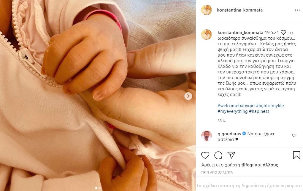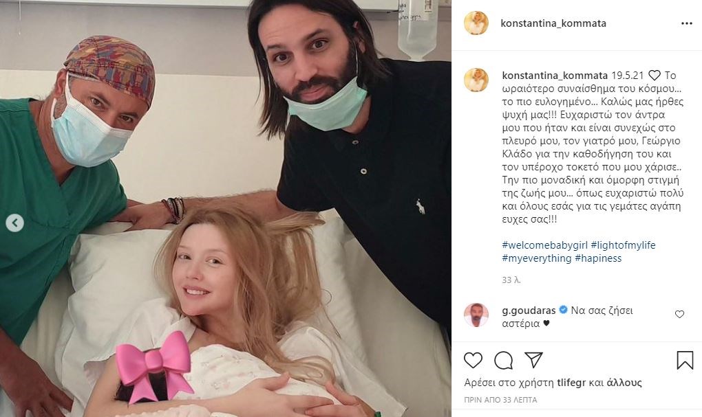 Την ευχάριστη είδηση έκανε γνωστή η Κωνσταντίνα Κομμάτα με ανάρτηση που έκανε στον προσωπικό λογαριασμό της στο Instagram μέσα από το μαιευτήριο κρατώντας στην αγκαλιά της τη νεογέννητη κόρη της.