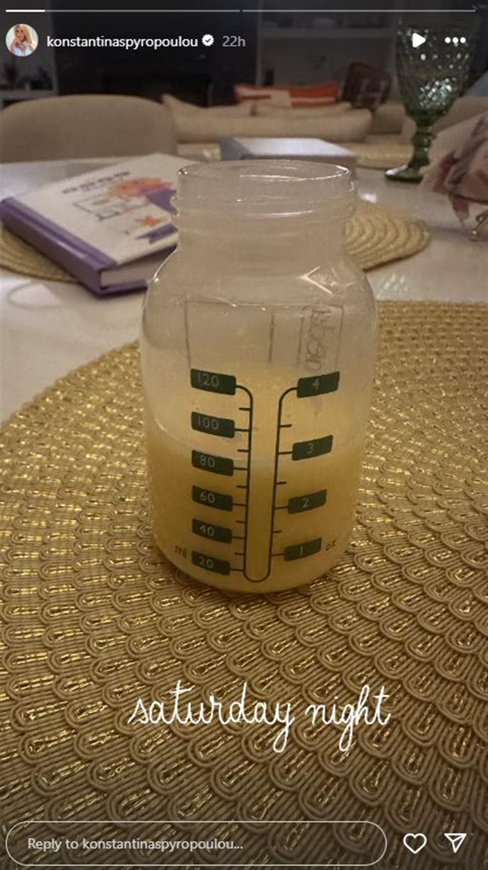 Στην ανάρτησή της, η Κωνσταντίνα Σπυροπούλου αποκάλυψε ότι ο γιος της θα φέρει το όνομα του πατέρα της, συνεχίζοντας έτσι την οικογενειακή παράδοση. Όπως συμβαίνει συχνά με τις μανούλες, η παρουσιάστρια ήταν ξύπνια αργά το βράδυ και μοιράστηκε μια φωτογραφία του μπιμπερό με το γάλα του μωρού της.