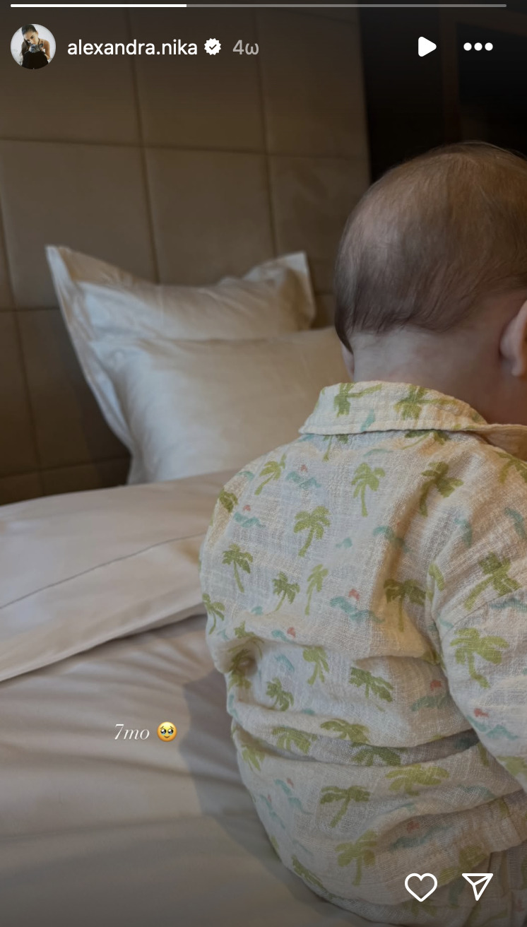 Το ζευγάρι, που αποφεύγει τα φώτα της δημοσιότητας αλλά δεν κρύβει τη χαρά του για τη νέα τους καθημερινότητα ως γονείς, διανύει μία από τις πιο όμορφες περιόδους της ζωής του. Η Αλεξάνδρα Νίκα ανέβασε στο Instagram ένα τρυφερό στιγμιότυπο με τον μικρό ξαπλωμένο στο κρεβάτι, γράφοντας λιτά: «7month».
