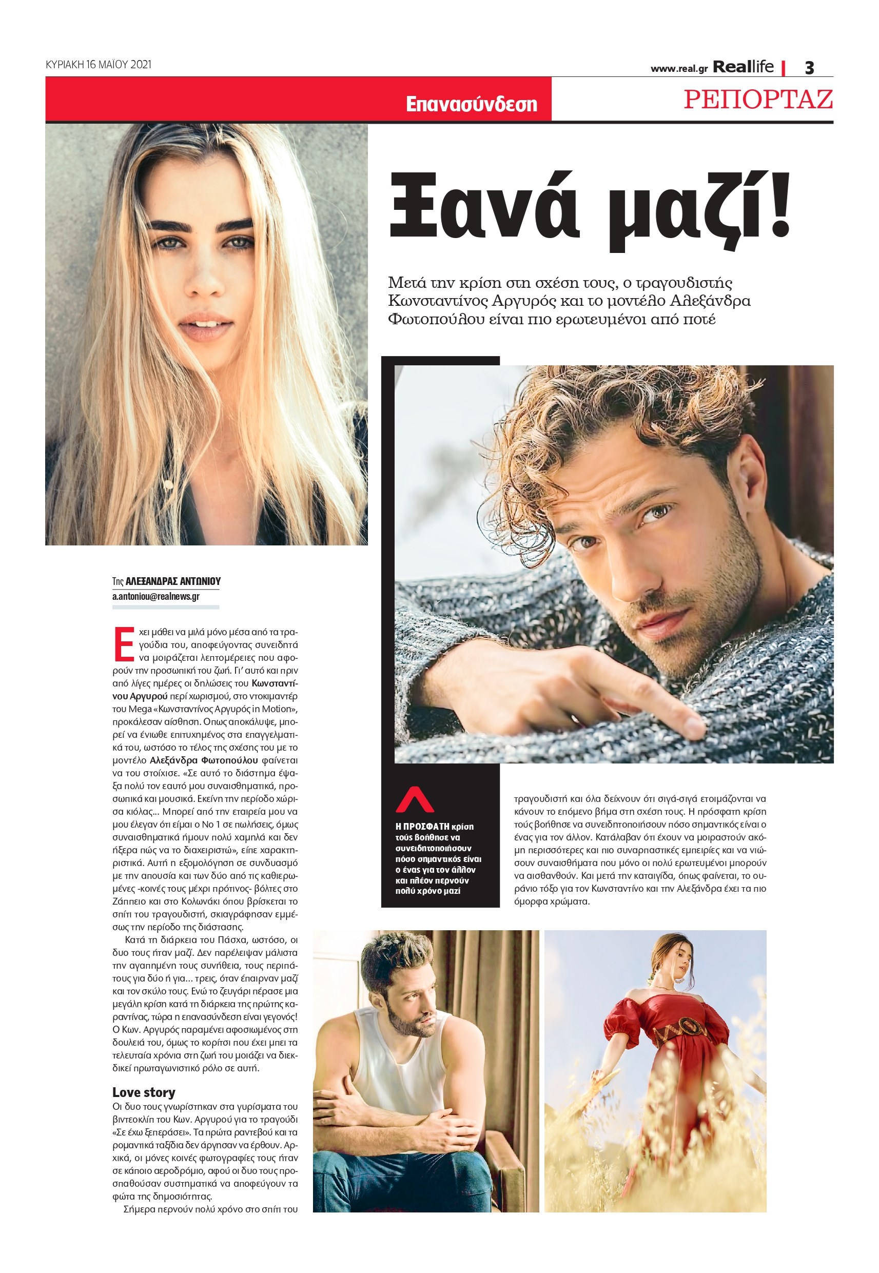 Αυτή η εξομολόγηση σε συνδυασμό με την απoυσία και των δύο από τις καθιερωμένες -κοινές τους μέχρι πρότινος- βόλτες στο Ζάππειο και στο Κολωνάκι όπου βρίσκεται το σπίτι του τραγουδιστή, σκιαγράφησαν εμμέσως την περίοδο της διάστασης. Κατά τη διάρκεια του Πάσχα, ωστόσο, οι δυο τους ήταν μαζί. Δεν παρέλειψαν μάλιστα την αγαπημένη τους συνήθεια, τους περιπάτους για δύο ή για… τρεις, όταν έπαιρναν μαζί και τον σκύλο τους. Ενώ το ζευγάρι πέρασε μια μεγάλη κρίση κατά τη διάρκεια της πρώτης καραντίνας, τώρα η επανασύνδεση είναι γεγονός! Ο Κων. Αργυρός παραμένει αφοσιωμένος στη δουλειά του, όμως το κορίτσι που έχει μπει τα τελευταία χρόνια στη ζωή του μοιάζει να διεκδικεί πρωταγωνιστικό ρόλο σε αυτή.