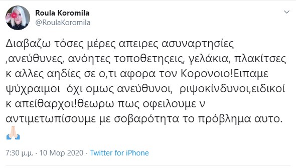 Η Ρούλα Κορομηλά σχολιάζει μέσω του λογαριασμού της στο twitter, τα όσα λέγονται το τελευταίο διάστημα για τον κορονοϊό. Η γνωστή παρουσιάστρια τονίζει ότι οφείλουμε να αντιμετωπίσουμε με σοβαρότητα το πρόβλημα, χωρίς ανεύθυνες και ανόητες τοποθετήσεις. “Διαβάζω τόσες ημέρες άπειρες ασυναρτησίες, ανεύθυνες, ανόητες τοποθετήσεις, γελάκια, πλακίτσες και άλλες αηδίες σε ο,τι αφορά τον Κορονοϊό! Είπαμε ψύχραιμοι όχι όμως ανεύθυνοι, ριψοκίνδυνοι, ειδικοί και απείθαρχοι! Θεωρώ πως οφείλουμε να αντιμετωπίσουμε με σοβαρότητα το πρόβλημα αυτο” έγραψε στο tweet.