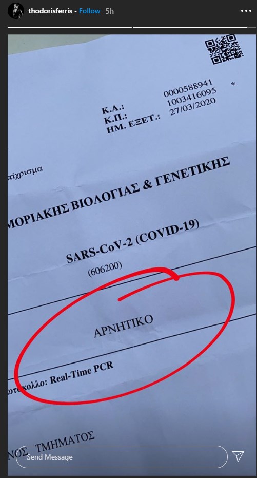 Σήμερα, ο αγαπημένος καλλιτέχνης επανήλθε με instastory ενημερώνοντας τους θαυμαστές του ότι έκανε ξανά το τεστ για τον κορονοϊό και βγήκε αρνητικό.