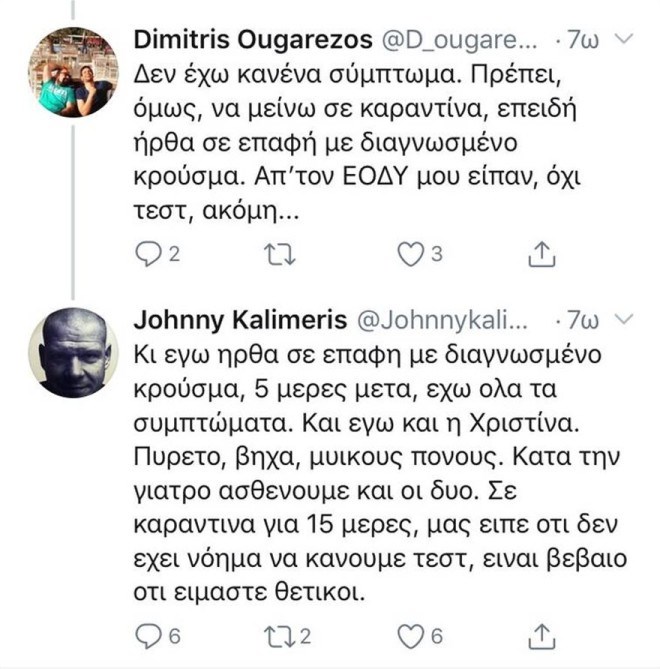 «Κι εγώ ήρθα σε επαφή με διαγνωσμένο κρούσμα, 5 μέρες μετά, έχω όλα τα συμπτώματα. Κι εγώ και η Χριστίνα. Πυρετό, βήχα, μυϊκούς πόνους. Κατά τη γιατρό ασθενούμε και οι δύο. Σε καραντίνα για 15 ημέρες. Μας είπε ότι δεν έχει νόημα να κάνουμε το τεστ, είναι βέβαιο ότι είμαστε θετικοί».