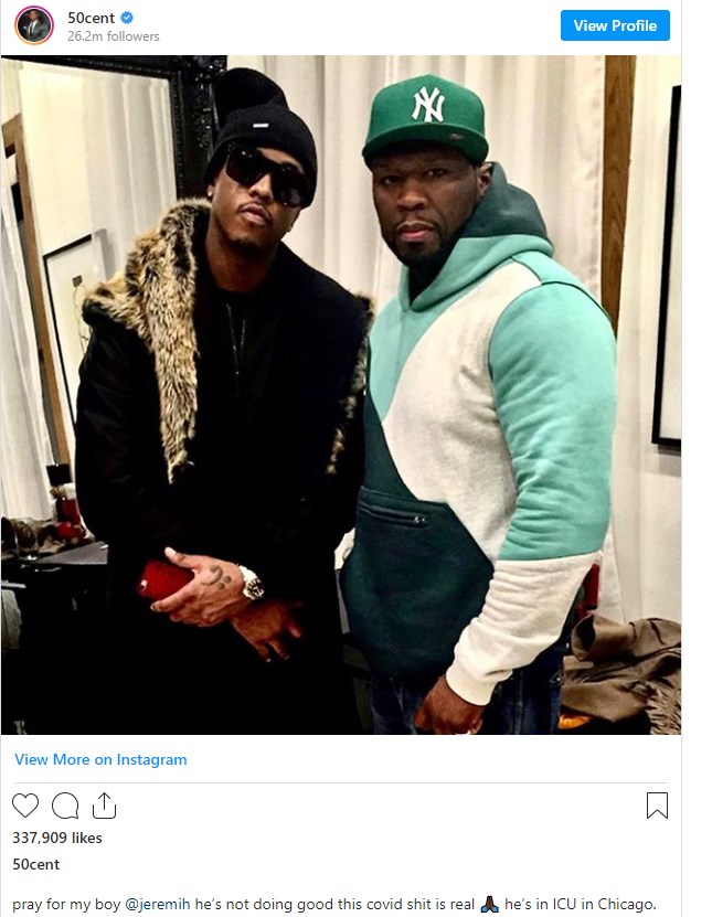 Ο 50 Cent, ο οποίος έχει επίσης συνεργαστεί με τον Jeremih, έγραψε επίσης tweets. “Προσευχήσου για το αγόρι μου Jeremih” και δημοσίευσε μια φωτογραφία των δύο τους. “Είναι στη ΜΕΘ σε νοσοκομείο στο Σικάγο” επιβεβαίωσε ο 50 Cent στο Instagram.