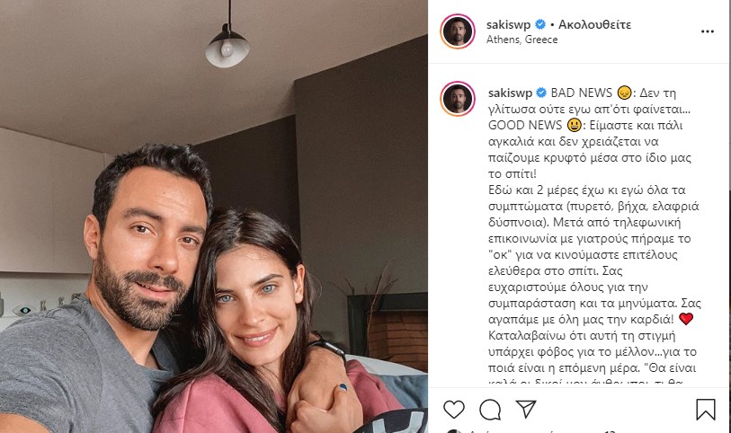 Αυτό γνωστοποίησε με μήνυμά του στο instagram ο γνωστός παρουσιαστής αναφέροντας τα εξής: «BAD NEWS: Δεν τη γλίτωσα ούτε εγώ απ’ ό, τι φαίνεται…GOOD NEWS: Είμαστε και πάλι αγκαλιά και δεν χρειάζεται να παίζουμε κρυφτό μέσα στο ίδιο μας το σπίτι! Εδώ και 2 μέρες έχω κι εγώ όλα τα συμπτώματα (πυρετό, βήχα, ελαφριά δύσπνοια). Μετά από τηλεφωνική επικοινωνία με γιατρούς πήραμε το “οκ” για να κινούμαστε επιτέλους ελεύθερα στο σπίτι. Σας ευχαριστούμε όλους για την συμπαράσταση και τα μηνύματα. Σας αγαπάμε με όλη μας την καρδιά! Καταλαβαίνω ότι αυτή τη στιγμή υπάρχει φόβος για το μέλλον… για το ποιά είναι η επόμενη μέρα.