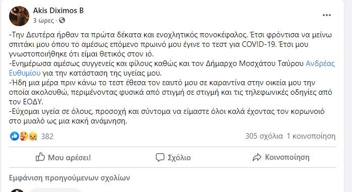 “Τη Δευτέρα ήρθαν τα πρώτα δέκατα και ενοχλητικός πονοκέφαλος. Έτσι φρόντισα να μείνω σπιτάκι μου όπου το αμέσως επόμενο πρωινό μου έγινε το τεστ για COVID-19. Έτσι μου γνωστοποιήθηκε ότι είμαι θετικός στον ιό. Ενημέρωσα αμέσως συγγενείς και φίλους καθώς και τον Δήμαρχο Μοσχάτου Ταύρου Ανδρέα Ευθυμίου για την κατάσταση της υγείας μου. Ήδη μια μέρα πριν κάνω το τεστ έθεσα τον εαυτό μου σε καραντίνα στην οικία μου την οποία ακολουθώ, περιμένοντας φυσικά από στιγμή σε στιγμή και τις τηλεφωνικές οδηγίες από τον ΕΟΔΥ. Εύχομαι υγεία σε όλους, προσοχή και σύντομα να είμαστε όλοι καλά έχοντας τον κορονοϊό στο μυαλό ως μια κακή ανάμνηση”.
