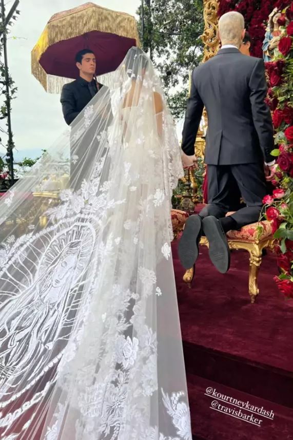 Το μυστήριο έγινε κεκλεισμένων των θυρών, ωστόσο κάποια στιγμιότυπα είδαν το φως της δημοσιότητας μέσα από τα social media των λαμπερών καλεσμένων. Η 43χρονη Κόρτνεϊ φόρεσε το μίνι νυφικό της με την τεράστια ουρά με την υπογραφή του οίκου D&G, ενώ ο γαμπρός με ένα μαύρο κοστούμι φαίνεται σε φωτογραφίες να κάθεται γονατιστός σε μια καρέκλα.