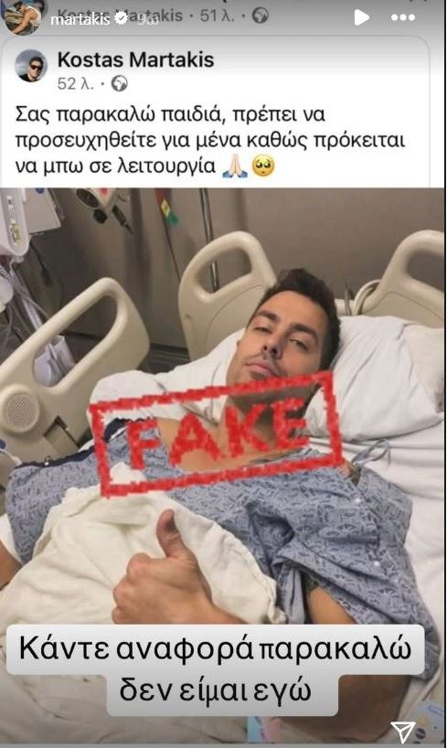 «Κάντε αναφορά παρακαλώ, δεν είμαι εγώ» έγραψε ο Κώστας Μαρτάκης στα social media και παράλληλα με αυτόν τον τρόπο καθησύχασε τον κόσμο που είχε ήδη ανησυχήσει.
