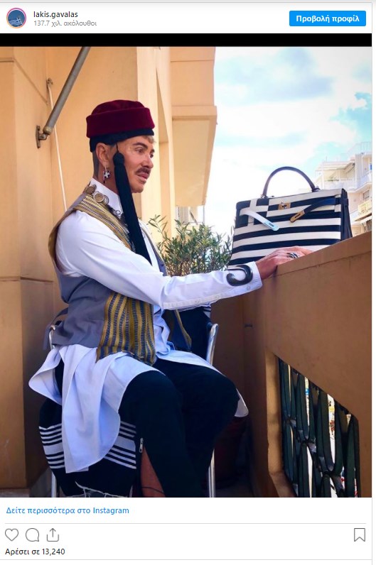 Με τον δικό του ξεχωριστό τρόπο τιμά την επέτειο του 1821 ο Λάκης Γαβαλάς. Ο γνωστός σχεδιαστής ανέβασε μία φωτογραφία ντυμένος τσολιάς στον προσωπικό του λογαριασμό στο Instagram συμπληρώνοντας το σύνολο με μια τσάντα στα χρώματα της ελληνικής σημαίας.