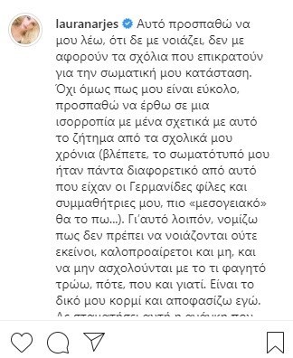 «Αυτό προσπαθώ να μου λέω, ότι δε με νοιάζει, δεν με αφορούν τα σχόλια που επικρατούν για την σωματική μου κατάσταση. Όχι όμως πως μου είναι εύκολο, προσπαθώ να έρθω σε μια ισορροπία με μένα σχετικά με αυτό το ζήτημα από τα σχολικά μου χρόνια (βλέπετε, το σωματότυπό μου ήταν πάντα διαφορετικό από αυτό που είχαν οι Γερμανίδες φίλες και συμμαθήτριες μου, πιο “μεσογειακό” θα το πω…). Γι’ αυτό λοιπόν, νομίζω πως δεν πρέπει να νοιάζονται ούτε εκείνοι, καλοπροαίρετοι και μη, και να μην ασχολούνται με το τι φαγητό τρώω, πότε, που και γιατί. Είναι το δικό μου κορμί και αποφασίζω εγώ. Ας σταματήσει αυτή η ανάγκη που σώνει και ντε πρέπει να είμαστε όλες και όλοι “κομμάτια” και “κόκκαλο” επειδή θεωρείται αρχικά από τα μίντια και την μόδα ιδανικό ομορφιάς. Το λέω και ας δουλεύω σε αυτόν τον χώρο που δουλεύω. Είμαι αυτή που είμαι προφανώς, “καμπυλωτή” και “μπαμπάτσικη” όπως λένε και πρέπει να είναι οκ. Αν θα αλλάξω κάτι θα το κάνω επειδή μου το επιβάλλει η υγεία μου. Μην αφήνετε κανέναν να μειώνει την αξία σας αν τυχόν διαφέρετε στα κιλά και στους πόντους της μεζούρας που θέλουν εκείνοι να έχετε. Είμαι μαζί σας σε αυτόν τον αγώνα», έγραψε χαρακτηριστικά στη λεζάντα τής ανάρτησής της η Λάουρα Νάργες.Δείτε την ανάρτηση: