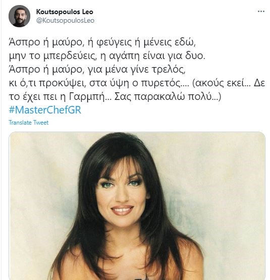 Ο γνωστός σεφ Λεωνίδας Κουτσόπουλος έκανε μία ανάρτηση στον προσωπικό του λογαριασμό στο Twitter με αφορμή το πείραγμα του Σωτήρη Κοντιζά σε μία διαγωνιζόμενη του MasterChef με το τραγούδι “Άσπρο μαύρο”, το οποίο έφερε διχογνωμία για το ποια τραγουδίστρια το έχει ερμηνεύσει.