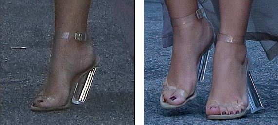 Όπως φαίνεται και στις φωτογραφίες τα τακούνια της δεν άντεξαν το βάρος της και λύγισαν. Η Κιμ προσπάθησε μέχρι την τελευταία στιγμή να ισορροπήσει πάνω σε αυτά, μέχρι να μπει στο αυτοκίνητο και φύγει.