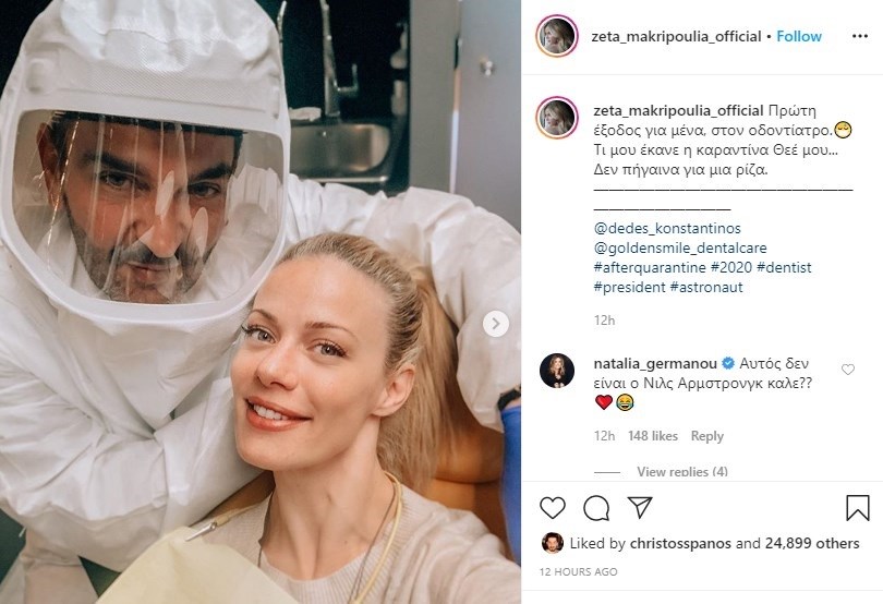 Την πρώτη της έξοδο από το σπίτι μετά την άρση των περιοριστικών μέτρων έκανε η Ζέτα Μακρυπούλια. Η ηθοποιός και παρουσιάστρια επέλεξε να επισκεφθεί τον οδοντίατρό της, αλλά μάλλον το μετάνιωσε αν κρίνουμε από το σχόλιο που έκανε στην ανάρτησή της στο Instagram. Με χιουμοριστική διάθεση, παρομοίασε τον οδοντίατρο, ο οποίος φορούσε ειδική στολή προστασίας, με… αστροναύτη. “Πρώτη έξοδος για μένα, στον οδοντίατρο. Τι μου έκανε η καραντίνα Θεέ μου… Δεν πήγαινα για μια ρίζα. @dedes_konstantinos @goldensmile_dentalcare #afterquarantine #2020 #dentist #president #astronaut” έγραψε στη λεζάντα. Ο οδοντίατρος Κωνσταντίνος Δέδες απάντησε άμεσα στο πνεύμα του διαστήματος… ότι ντύθηκε έτσι επειδή η Ζέτα είναι αστέρι. Ενώ και η Ναταλία Γερμανού τοποθετήθηκε επί του θέματος ρωτώντας “Αυτός δεν είναι ο Νιλς Άρμστρονγκ καλέ;”