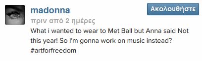 «Αυτό ήθελα να φορέσω στο Met Ball, αλλά η Άννα είπε: “Όχι φέτος”! Μήπως είναι καλύτερα, λοιπόν, να ασχοληθώ με τη μουσική μου;» έγραψε η Μαντόνα στο λογαριασμό της στο Instagram ποστάροντας μια φωτογραφία που τη δείχνει σχεδόν γυμνή.