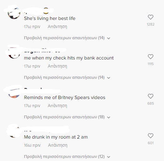 “Μου θυμίζει τα βίντεο της Μπρίτνεϊ Σπίαρς”, αναφέρει ένα σχόλιο στην δημοσίευσή της, “Έτσι είμαι και εγώ, όταν είμαι μεθυσμένη στο δωμάτιο μου” γράφει ένας άλλος.