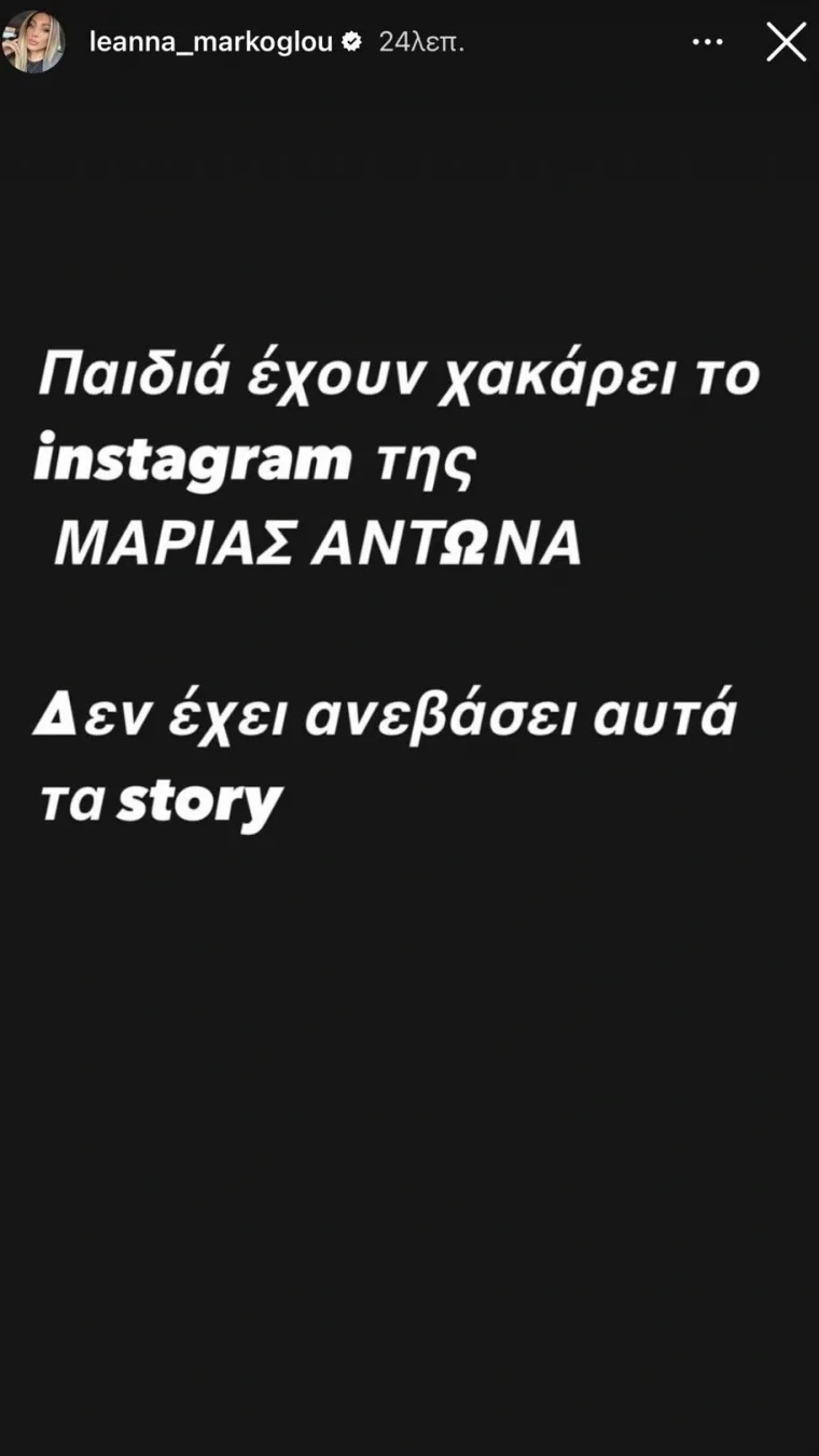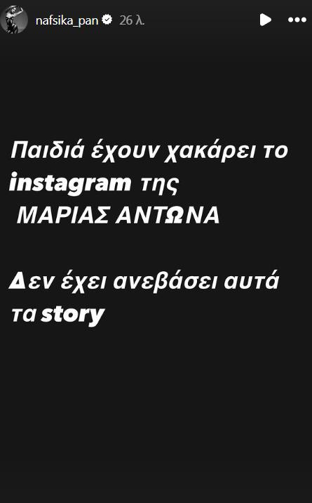 «Mόλις ανέκτησα το προσωπικό μου προφίλ στο Instagram. Θέλω να σας ενημερώσω ότι ο λογαριασμός μου πριν από λίγο παραβιάστηκε. Eυχαριστώ πολύ για την άμεση κινητοποίηση, για τις κλήσεις και τα μηνύματά σας. Προφανώς και δεν ήμουν εγώ αυτή που ανέβασε αυτά τα instagram stories και έστειλε αυτά τα μηνύματα.
