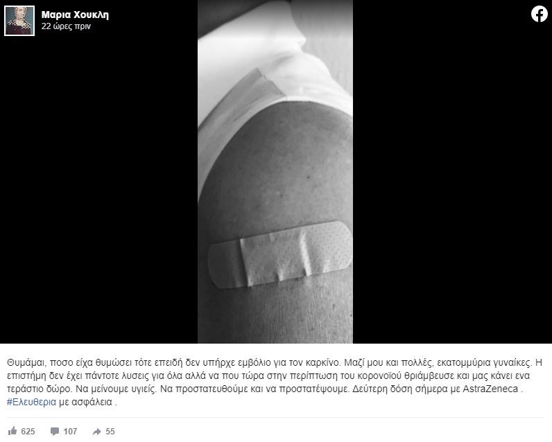 “Θυμάμαι, πόσο είχα θυμώσει τότε επειδή δεν υπήρχε εμβόλιο για τον καρκίνο. Μαζί μου και πολλές, εκατομμύρια γυναίκες. Η επιστήμη δεν έχει πάντοτε λύσεις για όλα αλλά να που τώρα στην περίπτωση του κορονοϊού θριάμβευσε και μας κάνει ένα τεράστιο δώρο. Να μείνουμε υγιείς. Να προστατευθούμε και να προστατέψουμε. Δεύτερη δόση σήμερα με AstraZeneca”, έγραψε στην ανάρτησή της η Μαρία Χούκλη.