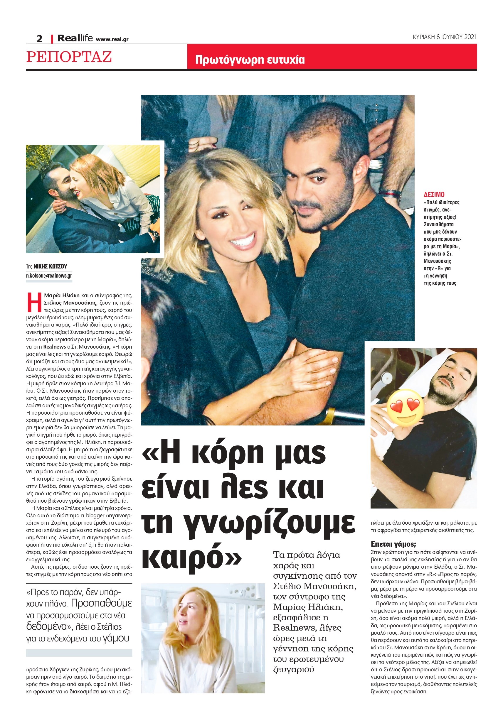 Η Μαρία Ηλιάκη και ο σύντροφός της, Στέλιος Μανουσάκης, ζουν τις πρώτες ημέρες με την κόρη τους, καρπό του μεγάλου έρωτά τους, πλημμυρισμένες από συναισθήματα χαράς. «Πολύ ιδιαίτερες στιγμές, ανεκτίμητης αξίας! Συναισθήματα που μας δένουν ακόμα περισσότερο με τη Μαρία», δηλώνει στη Realnews ο Στ. Μανουσάκης. «Η κόρη μας είναι λες και τη γνωρίζουμε καιρό. Θεωρώ ότι μοιάζει και στους δυο μας αντικειμενικά!», λέει συγκινημένος ο κρητικής καταγωγής γυναικολόγος, που ζει εδώ και χρόνια στην Ελβετία. Η μικρή ήρθε στον κόσμο τη Δευτέρα 31 Μαΐου. Ο Στ. Μανουσάκης ήταν παρών στον τοκετό, αλλά όχι ως γιατρός. Προτίμησε να απολαύσει αυτές τις μοναδικές στιγμές ως πατέρας. Η παρουσιάστρια προσπαθούσε να είναι ψύχραιμη, αλλά η αγωνία γι’ αυτή την πρωτόγνωρη εμπειρία δεν θα μπορούσε να λείπει. Τη μαγική στιγμή που ήρθε το μωρό, όπως περιγράφει ο αγαπημένος της Μ. Ηλιάκη, η παρουσιάστρια άλλαξε όψη. Η μητρότητα ζωγραφίστηκε στο πρόσωπό της και από εκείνη την ώρα κανείς από τους δύο γονείς της μικρής δεν παίρνει τα μάτια του από πάνω της. Η ιστορία αγάπης του ζευγαριού ξεκίνησε στην Ελλάδα, όπου γνωρίστηκαν, αλλά αρκετές από τις σελίδες του ρομαντικού παραμυθιού που βιώνουν γράφτηκαν στην Ελβετία.