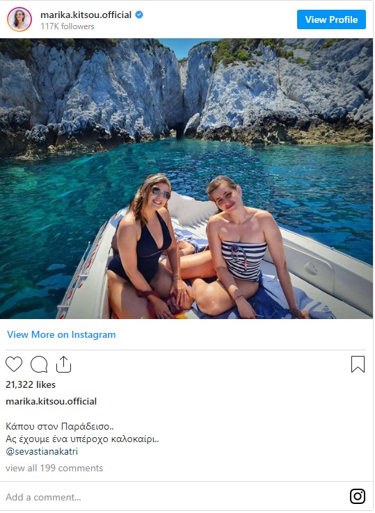 Η ηθοποιός Μαρία Κίτσου φόρεσε το στιλάτο ολόσωμο μαγιό της και πόζαρε μαζί με την φίλη της, με φόντο ένα μαγευτικό τοπίο, ενώ ευχήθηκε στους διαδικτυακούς της φίλους «καλό καλοκαίρι». Συγκεκριμένα έγραψε χαρακτηριστικά: «Κάπου στον Παράδεισο.. Ας έχουμε ένα υπέροχο καλοκαίρι».