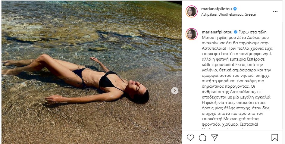 Η Μαρία Ναυπλιώτου μαζί με την Ζέτα Δούκα επέλεξαν την Αστυπάλαια για τις πρώτες διακοπές τους για φέτος το καλοκαίρι. Οι δύο ηθοποιοί απόλαυσαν τις πανέμορφες παραλίες του νησιού και τα εντυπωσιακά τοπία. Η Μαρία Ναυπλιώτου δημοσίευσε και στιγμιότυπα από τις εξορμήσεις τους στο νησί.