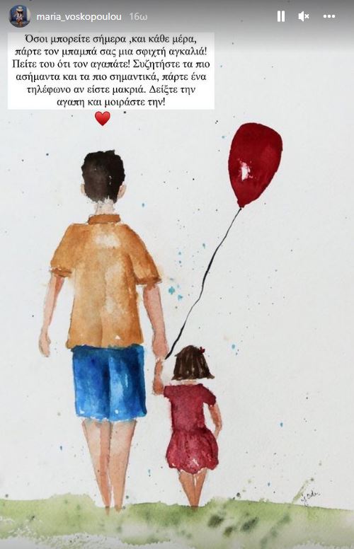 «Όσοι μπορείτε σήμερα, και κάθε μέρα, πάρτε τον μπαμπά σας μια σφιχτή αγκαλιά. Πείτε του ότι τον αγαπάτε. Συζητήστε τα πιο ασήμαντα και τα πιο σημαντικά, πάρτε ένα τηλέφωνο αν είστε μακριά. Δείξτε την αγάπη και μοιράστε την» έγραψε.
