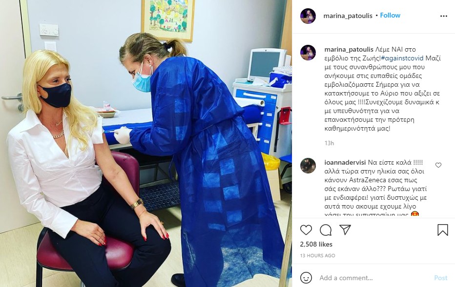 “Λέμε ΝΑΙ στο εμβόλιο της Ζωής!#αgainstcovid Μαζί με τους συνανθρώπους μου που ανήκουμε στις ευπαθείς ομάδες εμβολιαζόμαστε. Σήμερα για να κατακτήσουμε το Αύριο που αξιζει σε όλους μας !!!!Συνεχίζουμε δυναμικά κ με υπευθυνότητα για να επανακτήσουμε την πρότερη καθημερινότητά μας!” έγραψε στη λεζάντα. Ερωτηθείσα σε σχόλιο κάτω από τη φωτογραφία για το ποιο εμβόλιο έκανε, ανέφερε ότι έκανε αυτό της Pfizer/BionTech.