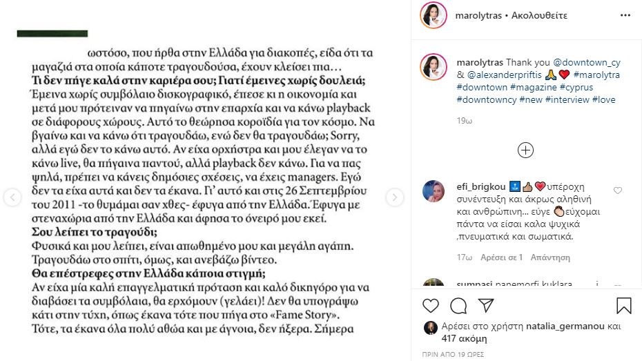 Τους λόγους που την οδήγησαν να φύγει από την Ελλάδα και να επιστρέψει στους γονείς της στον Καναδά αποκάλυψε σε συνέντευξη που παραχώρησε στο περιοδικό Down Town της Κύπρου η Μάρω Λύτρα.