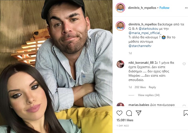 Το ζευγάρι άρχισε να δημοσιεύει τις πρώτες του φωτογραφίες μαζί στα social media. Η Μαρία Μπέη δημοσίευσε σε instastory της την πρώτη κοινή φωτογραφία με τον Δημήτρη Μπέλλο. Με αυτό το ενσταντανέ η νεαρή μαγείρισσα θέλησε να καλημερίσει τους followers της και φυσικά την αναδημοσίευσε και ο σύντροφός της. Χθες, ο Δημήτρης Μπέλλος έκανε μία αντίστοιχη ανάρτηση στο Instagram, όπου πόζαρε με τη σύντροφό του και μετά ανήρτησε και μια φωτογραφία τους από την νυχτερινή τους έξοδο για φαγητό.
