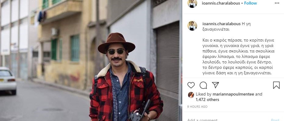 «Η γη ξαναγεννιέται Και ο καιρός πέρασε, το κορίτσι έγινε γυναίκα, η γυναίκα έγινε γριά, η γριά πέθανε, έγινε σκουλήκια, τα σκουλήκια έφεραν λίπασμα, το λίπασμα έφερε λουλούδι, το λουλούδι έγινε δέντρο, το δέντρο έφερε καρπούς, οι καρποί γίνανε δάση και η γη ξαναγεννιέται. Ιωάννης Χαραλάμπους Σας ευχαριστώ όλους για τις ευχές σας», έγραψε χαρακτηριστικά ο Ιωάννης.