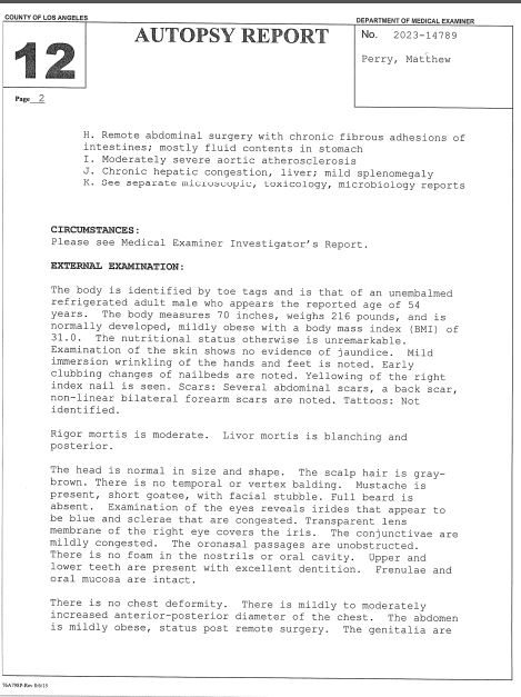 Ο θάνατος του σταρ προκλήθηκε από «οξείες επιδράσεις της κεταμίνης», αλλά ο ιατροδικαστής παρατήρησε ότι η ποσότητα που βρέθηκε στον οργανισμό του Μάθιου Πέρι δεν θα μπορούσε να ήταν από την τελική θεραπεία έγχυσης 1,5 εβδομάδα πριν από το θάνατό του.
