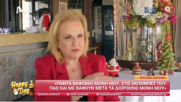 «Δεν θα υπάρξει γυναίκα, που αν προσέξει τον εαυτό της, δεν θα γίνει ωραία. Πάντα βάφομαι μόνη μου. Και να με με βάψουν στις εκπομπές, πρέπει να τα διορθώσω. Είμαι κατά των αισθητικών επεμβάσεων. Και με ρυτίδα τι έγινε; Κοιτάζεσαι, θαυμάζεσαι. Χρειάζεται να φαίνεσαι 20άρα; Αν είναι δυνατόν. Πέρασες από εκείνη τη φάση. Το απόλαυσες, πάμε παρακάτω. Να έχεις τις ρυτίδες σου, να βάλεις τα σκουλαρίκια σου και να κάνεις τα βαψίματά σου» είπε η Ματίνα Παγώνη.