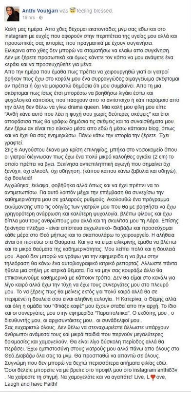 Το να ξέρεις πως θα μείνεις εκτός για πολύ καιρό αλλά θα σε περιμένει η δουλειά σου είναι αληθινή ευλογία.. Η Κατερίνα, ο Θέμης αλλά και όλη η ομάδα του “Φτιάξε καφέ” μου έχουν σταθεί από την αρχή. Το ίδιο και οι συνεργάτες μου στην εφημερίδα “Παραπολιτικά”. Ο εκδότης μου , ο διευθυντής μου, οι αρχισυντάκτες μου.. οι συνάδελφοί μου.. Σας ευχαριστώ όλους. Δεν θέλω να στεναχωριέστε άλλωστε υπάρχουν άνθρωποι ανάμεσα τους και μικρά παιδιά που περνούν μεγαλύτερες δοκιμασίες και χαμογελούν. Θα είναι λίγο δύσκολη περίοδος αλλά θα περάσει. Έχω εμπιστοσύνη στους γιατρούς μου αλλά πάνω από όλους στο Θεό. Διαβάζω όλα σας τα μηνυματα. Θα προσπαθώ να απαντώ σε όλους. Συγνώμη που δεν μπορώ να δεχτώ περισσότερα αιτήματα φιλίας εδώ. Όσοι θέλετε μπορείτε να με βρείτε στο προφίλ μου στο instagram anthi83v . Να χαίρεστε τη στιγμή. Να χαμογελάτε και να αγαπάτε!”