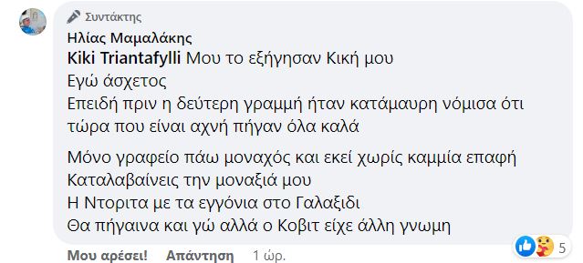 “Καραντίνα τέλος. Δυο απανωτά τεστ βγήκαν αρνητικά. Προσοχή τώρα, μάσκα, πλύσιμο χεράκια και μπόλικο οινόπνευμα στα χέρια και το πρόσωπο. Χίλια ευχαριστώ για τις ευχές σας για γρήγορη ανάρρωση που έπιασαν. Περισσότερες ευχές πήρα τώρα παρά στην γιορτή μου πράγμα που θεωρώ ιδιαίτερα σημαντικό. Συνεχίζω λοιπόν πιο προσεκτικά και με μεγάλη δίψα. Ευχαριστώ και πάλι” έγραψε αρχικά ο Ηλίας Μαμαλάκης.