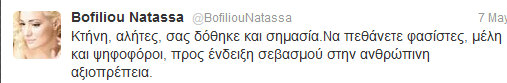 Η τραγουδίστρια Νατάσα Μποφίλιου, την επομένη των εκλογών, ξέσπασε με ένα μήνυμά της στο twitter. Ένα μήνυμα γεμάτο οργή και θυμό…