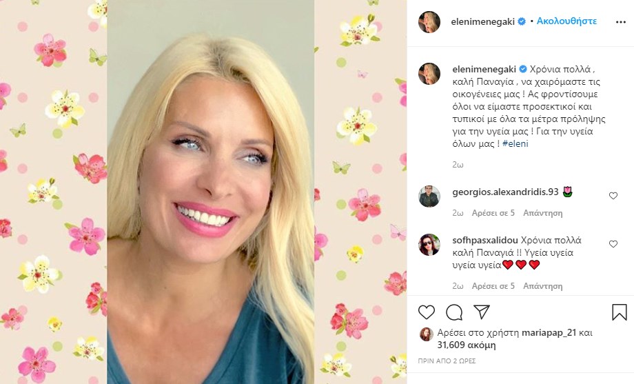 Μήνυμα με αφορμή τον Δεκαπενταύγουστο έστειλε η Ελένη Μενεγάκη. Η παρουσιάστρια έκανε έκκληση στους διαδικτυακούς της φίλους να τηρούν τα μέτρα προστασίας για τον κορονοϊό και να είναι όλοι προσεκτικοί. “Χρόνια πολλά , καλή Παναγία , να χαιρόμαστε τις οικογένειες μας ! Ας φροντίσουμε όλοι να είμαστε προσεκτικοί και τυπικοί με όλα τα μέτρα πρόληψης για την υγεία μας ! Για την υγεία όλων μας!” έγραψε η παρουσιάστρια.